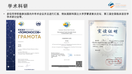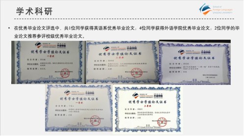 学术科研方面,多位学生积极参加国内外学术会议并且进行汇报,例如莫斯科国立大学罗蒙诺索夫论坛,第三届全国临床语言学学术研讨会等。在优秀毕业论文评选中,1人获得英语系优秀毕业论文;4人获得小欧视频